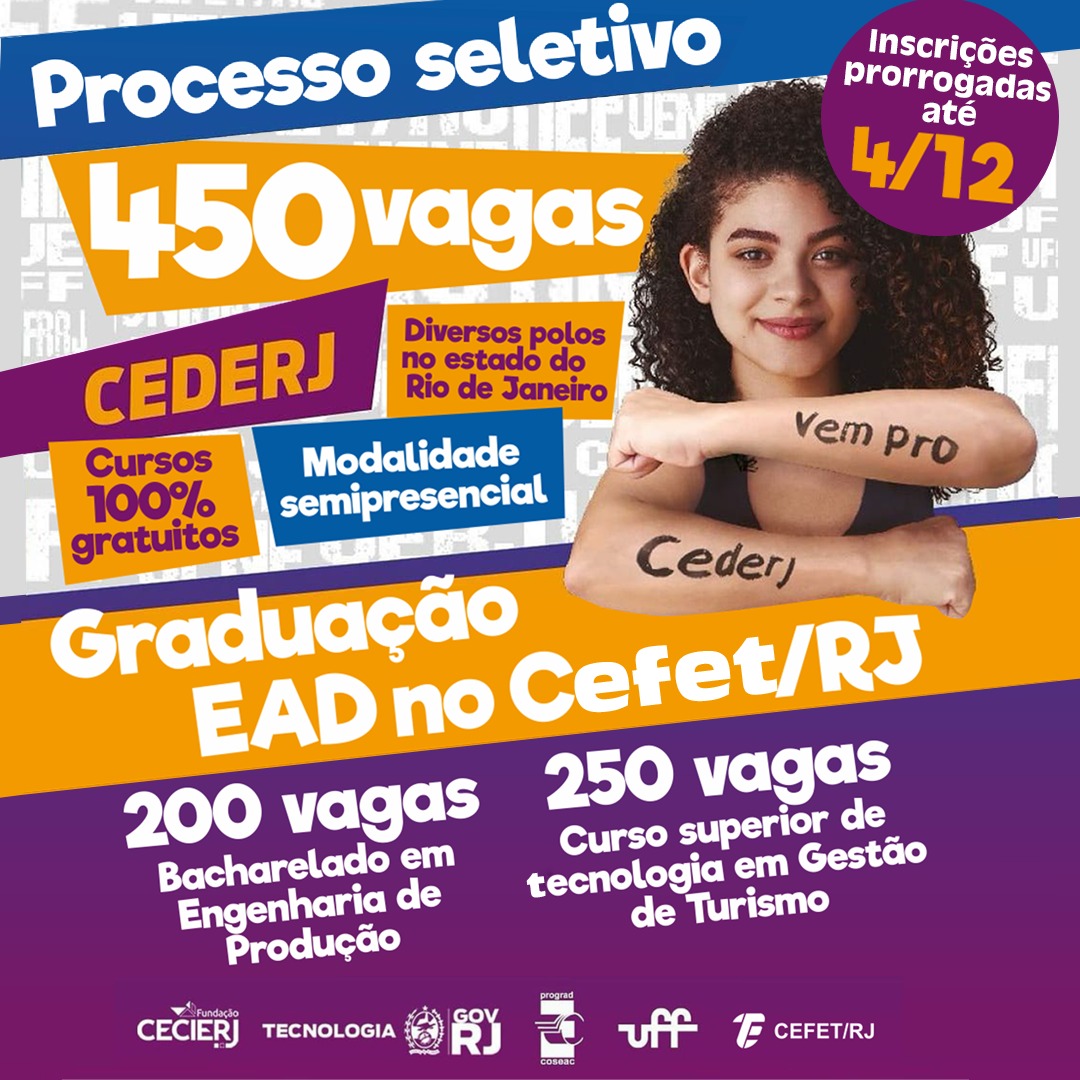 Foram prorrogadas, até o dia 4 de dezembro, as inscrições do processo seletivo para os cursos superiores a distância do Cefet/RJ, na modalidade semipresencial, no âmbito do Consórcio Cederj. A taxa de inscrição é de R$89,90 e pode ser paga até o dia 5 de dezembro. O ingresso é para o primeiro semestre de 2025.