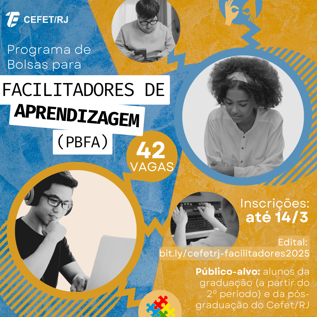A Diretoria de Ensino (DIREN) do Cefet/RJ divulgou, nesta segunda-feira (10), as inscrições para estudantes interessados em participar do Programa de Bolsas para Facilitadores de Aprendizagem (PBFA). A iniciativa tem como objetivo acompanhar alunos com deficiência e/ou transtorno de aprendizagem na realização de atividades pedagógicas e na interação com o professor. Ao todo, são ofertadas 42 vagas imediatas, distribuídas entre todas as unidades da instituição, além da formação de um cadastro de reserva. Os candidatos devem preencher o formulário disponível no link https://forms.office.com/r/qLLJ6HK31M até o dia 14 de março e seguir as orientações do edital.
