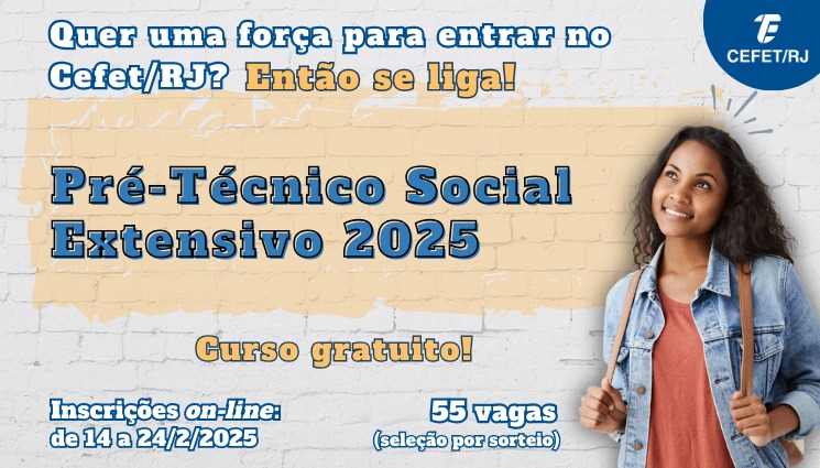 A Diretoria de Extensão (DIREX), por meio do Departamento de Extensão e Assuntos comunitários (DEAC), divulga o edital para a seleção de estudantes interessados em participar do projeto Pré-Técnico Social Cefet/RJ Extensivo 2025, da Unidade Maracanã.