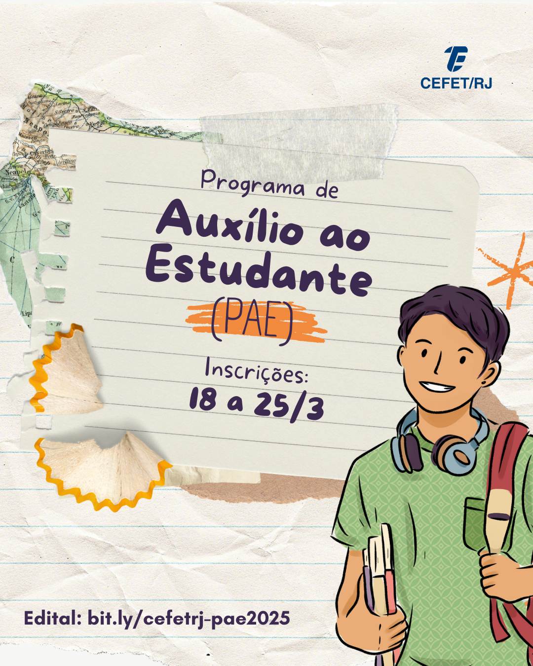 A Diretoria de Extensão, por meio do Departamento de Extensão e Assuntos Comunitários (DEAC), publicou o edital que oferta 2.040 bolsas no Programa de Auxílio ao Estudante (PAE), sendo 1.700 disponibilizadas no primeiro semestre e 340 no segundo. As inscrições para os auxílios do primeiro período letivo deverão ser realizadas entre os dias 18 e 25 de março pelo site assistenciaestudantil.cefet-rj.br. Os contemplados terão direito a um valor mensal de R$ 300 durante a vigência estabelecida no edital.