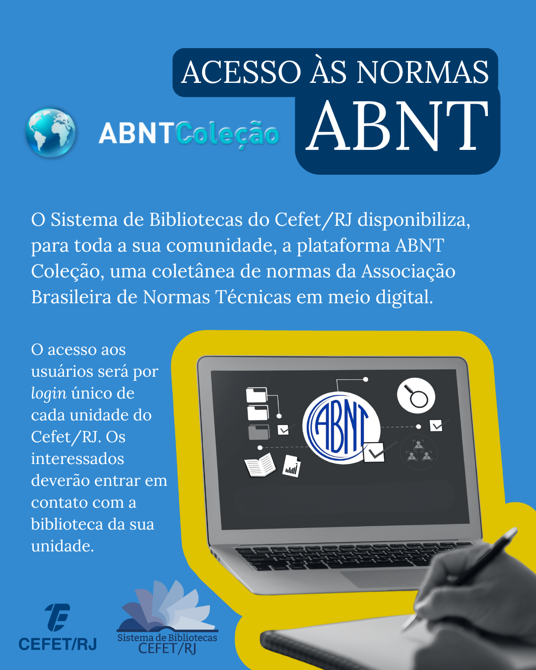 O Sistema de Bibliotecas do Cefet/RJ disponibiliza, para toda a sua comunidade, a plataforma ABNT Coleção, uma coletânea de normas da Associação Brasileira de Normas Técnicas (ABNT) em meio digital. Alunos, servidores docentes e técnico-administrativos podem utilizar a ferramenta e realizar consultas para desenvolverem seus trabalhos e pesquisas acadêmicas.