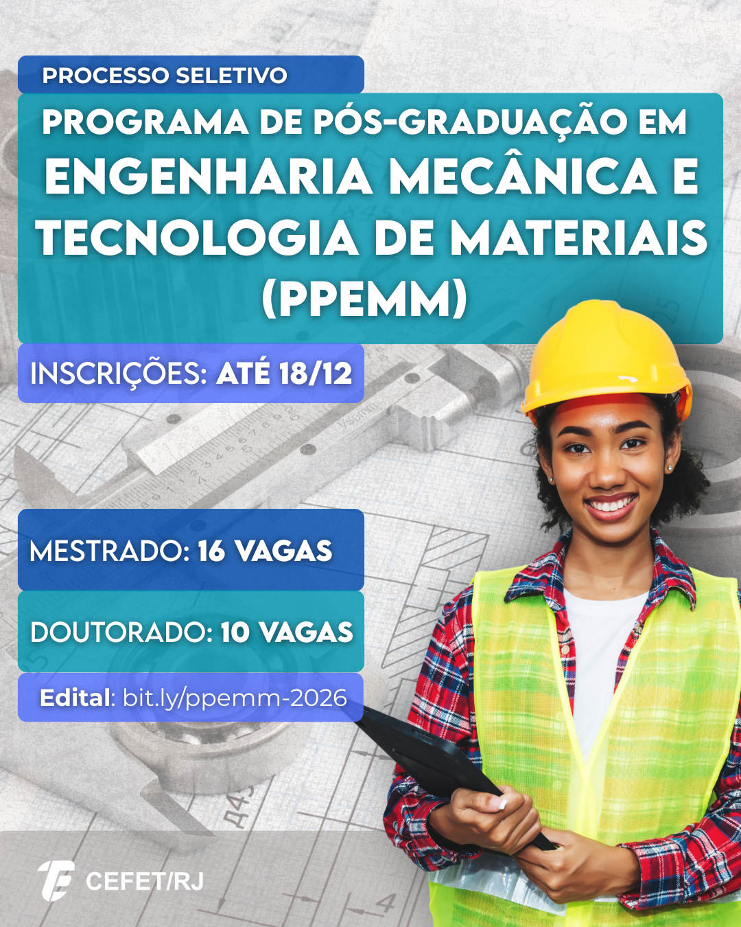 O Programa de Pós-Graduação em Engenharia Mecânica e Tecnologia de Materiais (PPEMM) está com inscrições abertas para 16 vagas de mestrado e 10 de doutorado. O prazo para se candidatar à oportunidade termina em 18 de dezembro. Podem se inscrever candidatos que possuam diploma de curso superior em Engenharia ou bacharelado em áreas afins reconhecido pelo Ministério da Educação ou revalidado no Brasil. Para concorrer ao doutorado, também será necessário ter diploma de mestrado em curso reconhecido pela CAPES com avaliação igual ou superior a 3.