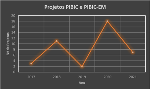 Figura 1. Número de projetos PIBIC e PIBIC-EM desenvolvidos pelo campus ao longo dos anos.