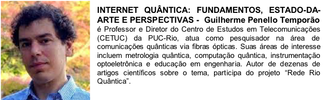 Minicurso 1 (2ª parte): Internet Quântica (Auditório 5) Sessão Técnica 2: (Auditório 2) - Vejam os trabalhos desta sessão no final da página |