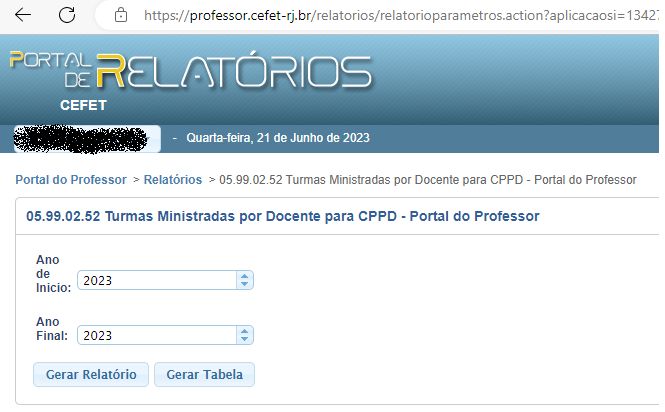 Na página do Relatório "05.99.02.52 Turmas Ministradas por Docente para CPPD - Portal do professor" selecione o ano do início e de término do relatório a ser gerado: