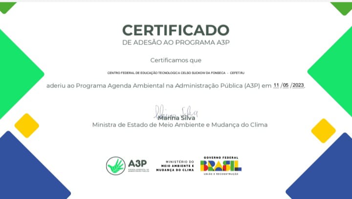 Em 2023, o Cefet/RJ renovou sua adesão ao PROGRAMA AGENDA AMBIENTAL NA ADMINISTRAÇÃO PÚBLICA - A3P com a publicação do Certificado de Adesão ao Programa A3P, que celebra o compromisso da instituição com o MMA, visando estimular a implementação de práticas de sustentabilidade.